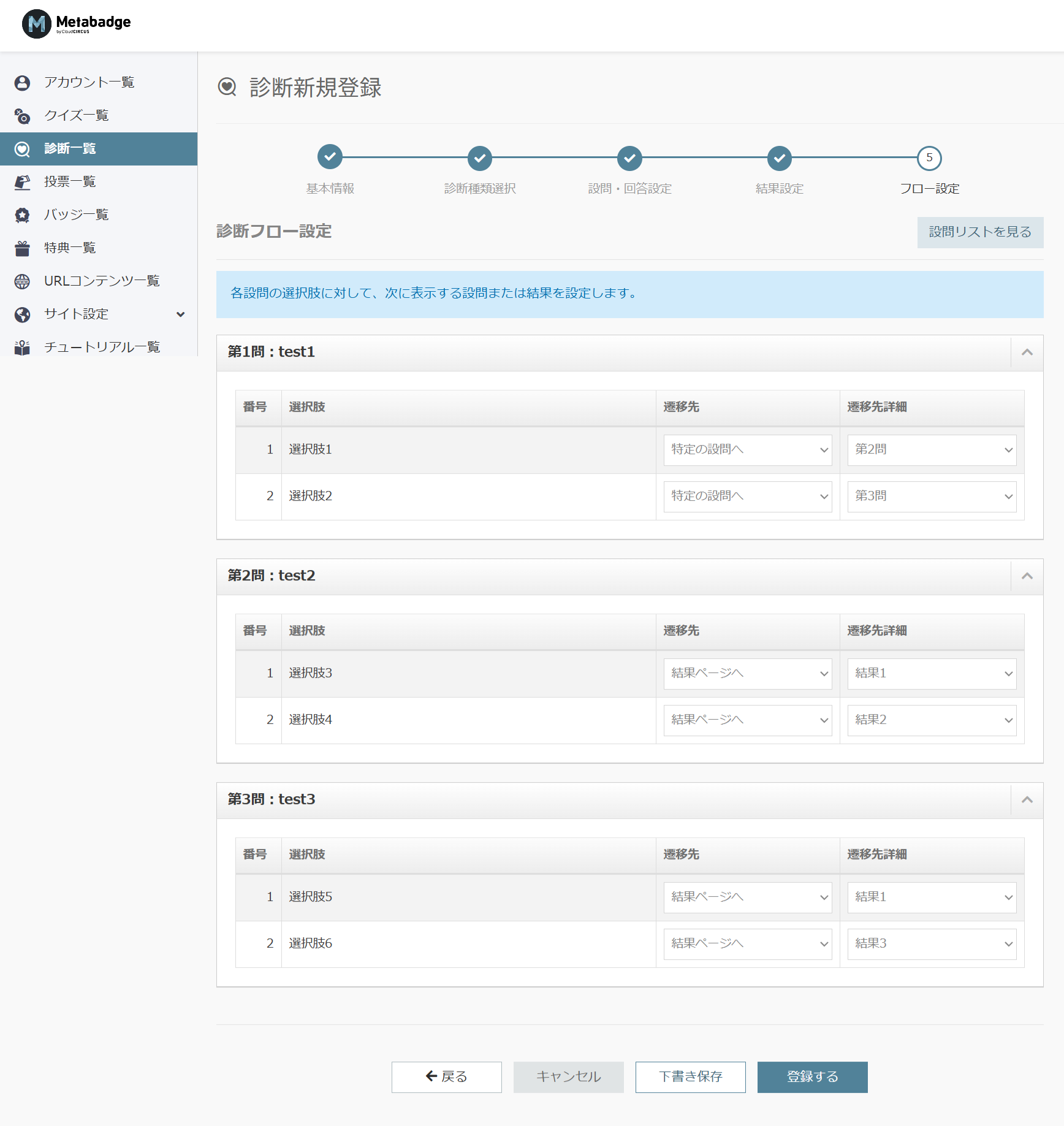 診断フロー設定画面にて各回答の遷移フローを設定します。