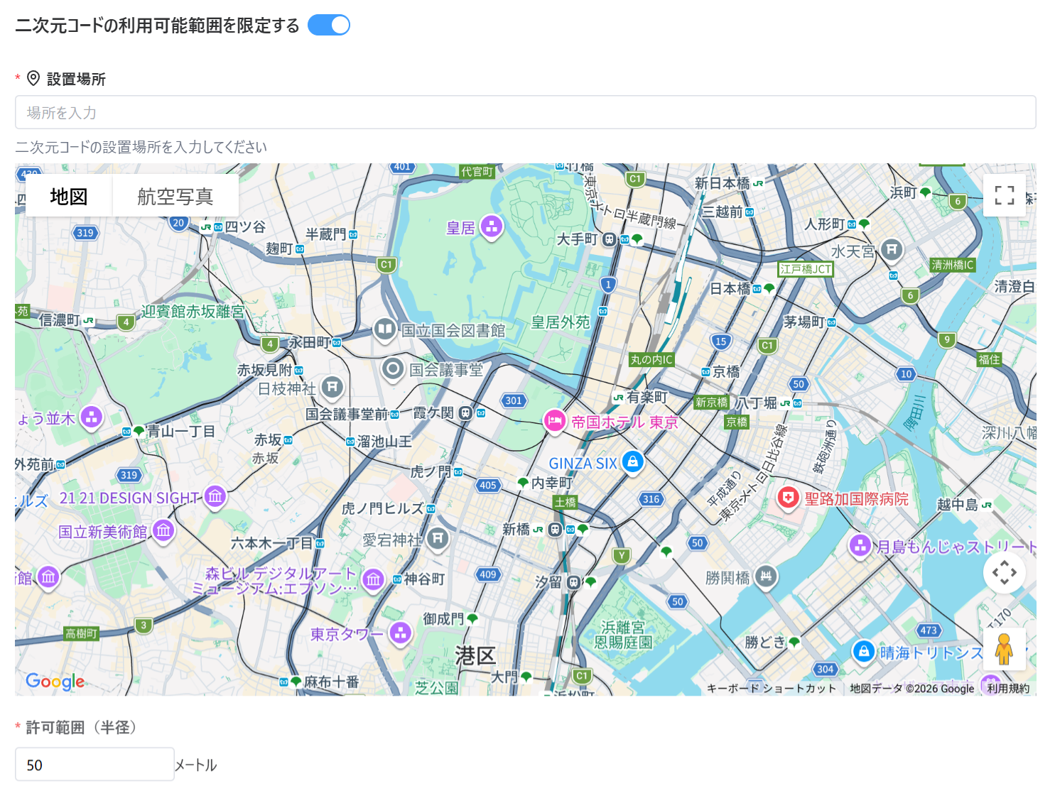ラジオボタンをONにすることでGPSを使用して二次元コードの利用可能な範囲を制限できます。 地点の指定はGoogleMapを使用して行い、 半径50mから999mまでの範囲を指定可能です。 ※推奨範囲200m以上